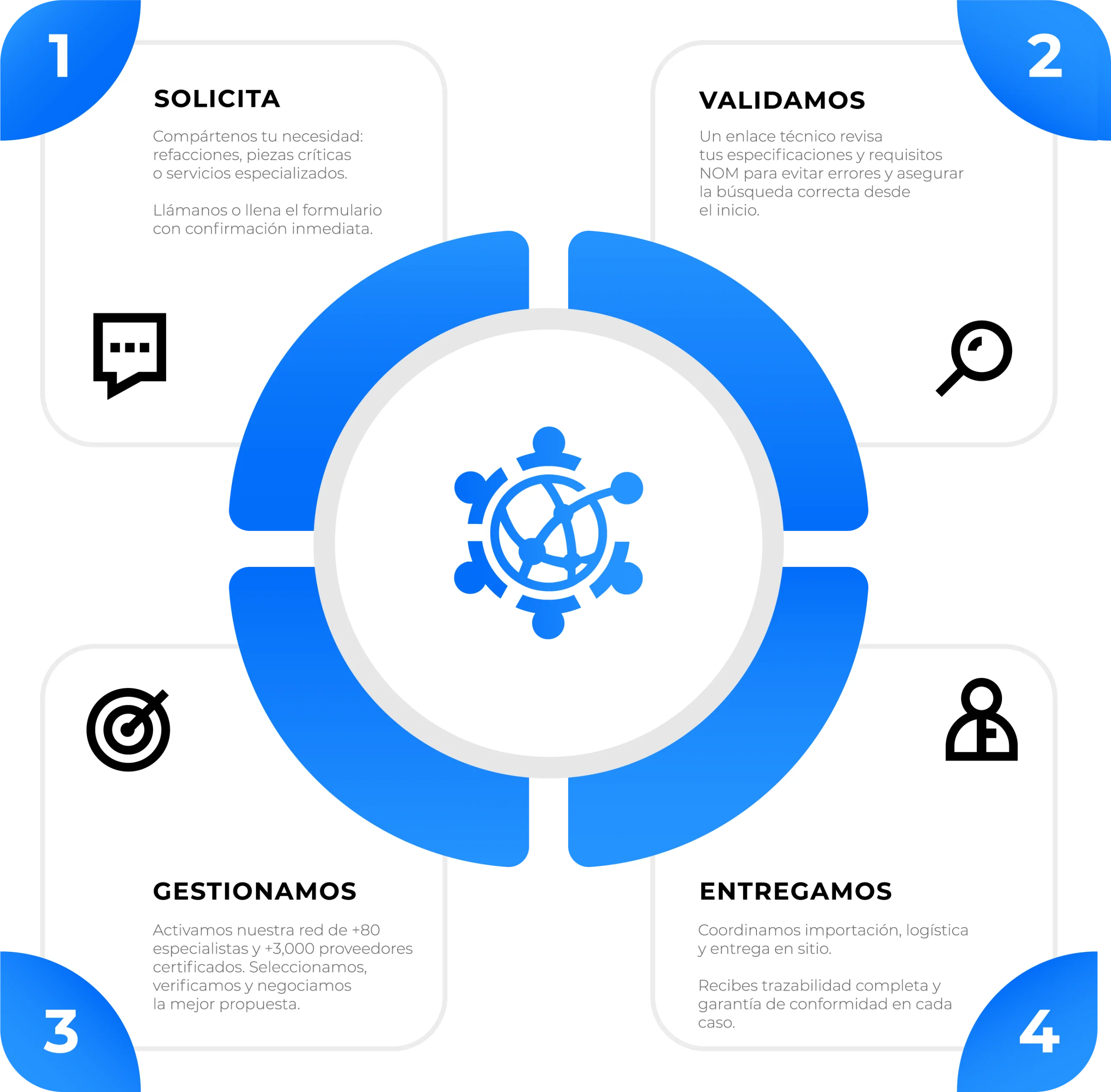 Conectamos a tu equipo con especialistas en compras, ingeniería y proveedores certificados para resolver urgencias, optimizar tus procesos de abastecimiento y cuidar el costo y presupuesto asignado.